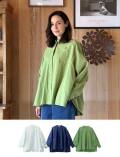 立体感のある袖デザインが特徴的なバンドカラーシャツ。肩から袖にかけてのボリュームが女性らしい柔らかさを演出。さらっとした軽やかな素材で季節の変わり目にもぴったりです。